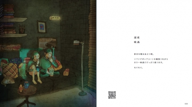 温かみのあるタッチのPuuung氏のイラストは、見る人にどこか懐かしさを感じさせます。登場するのは何気ないカップルと1匹の猫。夜中に部屋でホラー映画を見ながら2人で食べるポップコーン、食後にどちらがお皿を洗うかをかけてジャンケン…など、穏やかで微笑ましい日常が描かれています。