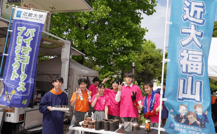 近畿大学附属広島高等学校福山校では、福山市の地域発展と持続可能な未来を目指し、福山市で年間100万本廃棄されるばら剪定枝の有効活用について探究してきました。令和7年(2025年)5月に開催された「第58回福山ばら祭2025」では、ばら剪定枝を原料として製造したバイオリサイクル燃料「ばらのバイオコークス」の燃焼実験を行い、焼き芋を焼いて約3,200名の方に試食していただき、バイオコークス認知拡大に取り組みました。