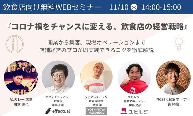 吉野家ホールディングスグループの株式会社シェアレストランは、Googleマイビジネスを活用した店舗の集客支援サービスを行う株式会社エフェクチュアル(本社:東京都港区、代表取締役:田中倫明)主催の11月10日(火)「コロナ禍をチャンスに変える、飲食店の経営戦略」をテーマとした、飲食店経営者と開業希望者向けの無料オンラインセミナーに、iPhoneやiPod touchをオーダリングシステム端末にする「ユビレジ」を運営する株式会社ユビレジと、話題の飲食店「A1カレー」「Noza Caza」経営者の2名と共に参加いたします。