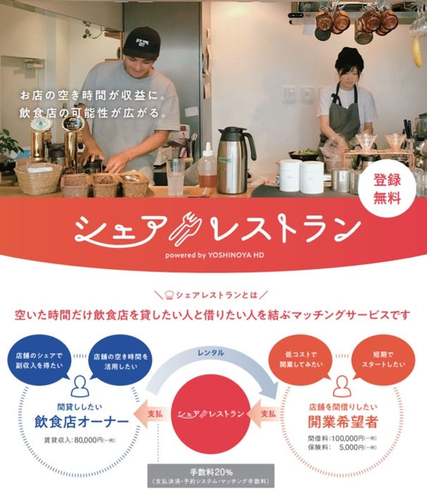これから飲食店をはじめたい開業希望者は、「シェアレストラン」サイトから、飲食店やバー・レストラン・カフェなどの空き時間帯を検索し、好みに合う地区の店舗を月額定額で間借りすることができ、投資をせずに低リスクで飲食店を開業することができます。また、飲食店オーナー様は、保有店舗の空き時間の有効活用し収益化することで、より安定的な飲食店経営が可能になります。本サービスは、飲食店を通じ「新しい仲間の募集に取り組みたいオーナー様と、低リスクで飲食店を開業したい利用者」をマッチングするプラットフォームです。
