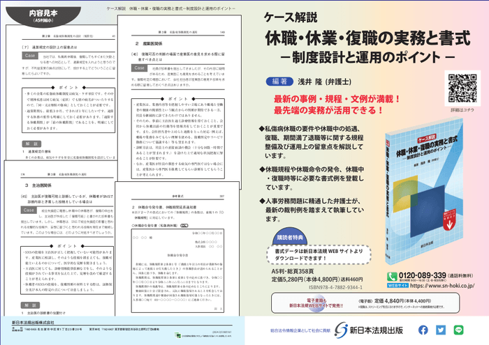 新日本法規出版株式会社(所在地:愛知県名古屋市中区栄1丁目23番20号、代表取締役:星謙一郎 (https://www.sn-hoki.co.jp/))は、【ご購読者専用ダウンロードサービス】付書籍「ケース解説 休職・休業・復職の実務と書式-制度設計と運用のポイント-」を2024年4月1日に発売いたしました!