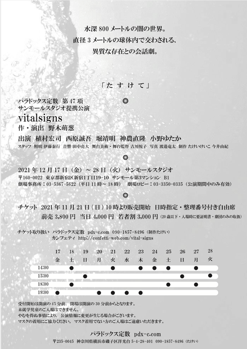 パラドックス定数(設立1998年、主宰:野木萌葱)主催による、パラドックス定数第47項サンモールスタジオ提携公演『vitalsigns』が2021年12月17日 (金) ~2021年12月28日 (火)にサンモールスタジオ(東京都新宿区)にて上演されます。チケットはカンフェティ(運営:ロングランプランニング株式会社、東京都新宿区、代表取締役:榑松 大剛)にて発売中です。