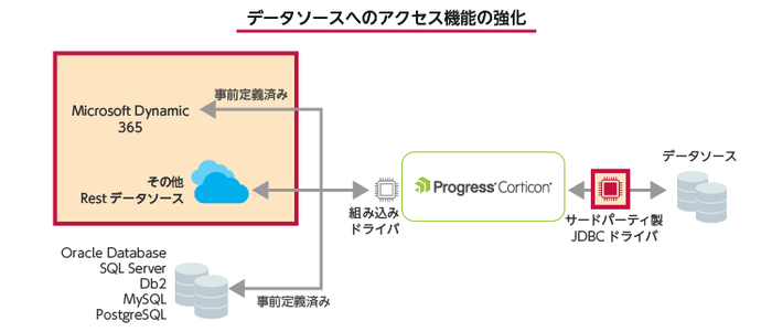 Progress Corticon付属のEnterprise Data Connector機能では、システム 要件を満たしたデータベースアクセスのみを許可していましたが、サードパーティ製のデータベースドライバ取り込みを可能とすることで、システム要件にないデータベースにもアクセスできるようになりました。これにより、ITに対する深い知識がなくてもルールに基づくデータ処理を自動化できます。