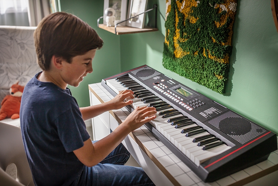 『E-X10』には、一緒に弾いて楽しめる140種類の内蔵曲を搭載。それぞれの内蔵曲には3つのレッスン・モードを備えており、正しいタイミングで演奏できたか、正しい音符で演奏できたか、正しい音符を正しいタイミングで演奏できたかを評価してくれるので、練習へのモチベーションアップにもつながります。その他、メトロノームや録音機能も搭載しており、効果的に練習することができます。