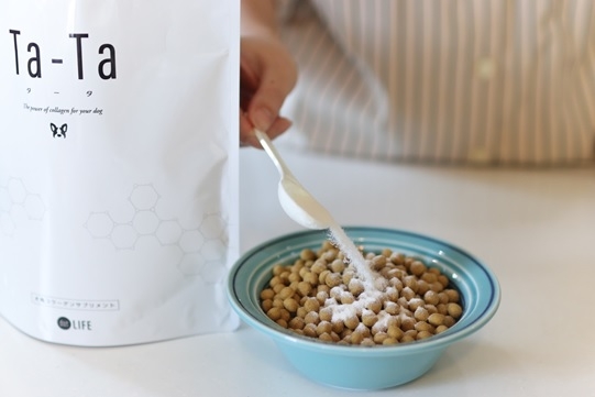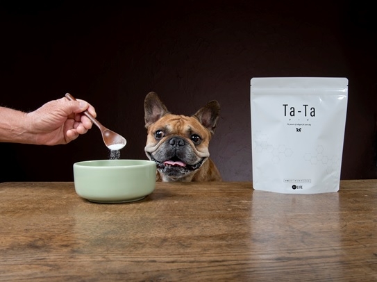 「Ta-Ta」は、原料としてコラーゲン100%にこだわったペット用サプリメントです。アミノ酸が豊富に含まれるコラーゲンは、人間用と同じグレードを使用し、吸収力を高めるために分子を細かくした粒子状となっており、毎日の食事にふりかけるだけで、日常の食生活で不足しがちな栄養分を効率よく補うことができます。