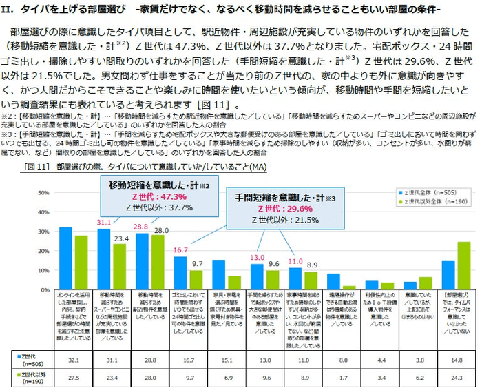 「住みパ」を構成する「コスパ」「タイパ」「スぺパ」について、世代にかかわらず重視する人が多い中、とりわけZ世代はより高い割合で“住みパ”を意識して部屋選び・家具家電選びを行っていることが分かりました。デジタルネイティブ世代でもある「Z世代」は、何かを買ったりどこかへ行ったりする際もインターネットやSNSを活用して素早く情報を集め、なるべく短時間で選択にたどり着くことを重視していると考えられます。そしてそれはデジタルの中だけでなく、オフラインで行われる行動でも同様で、家事や移動といったオフラインでのアクションに際しても無駄を避け、省略しても支障がないものはやらない、同時にできることは同時にやる意識が強いと思われます。部屋選び・家具家電選びにおいてもそういった「タイパ」を重視する傾向が強く出る結果となりました[図9]。