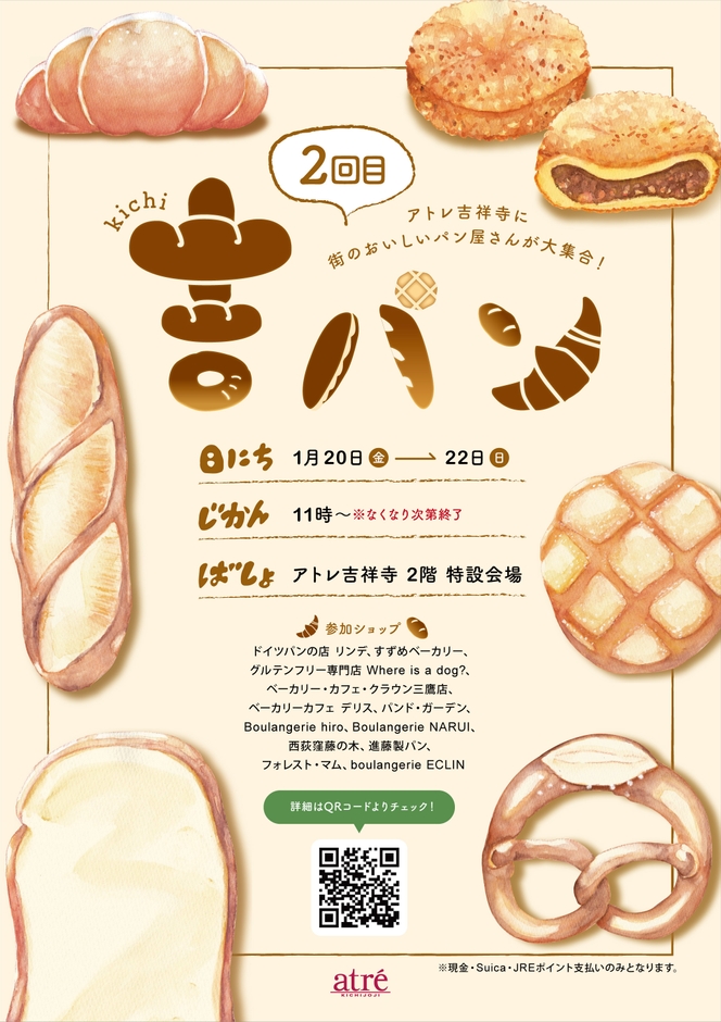 株式会社アトレ(本社:東京都渋谷区、代表取締役社長:一ノ瀬 俊郎)が運営するアトレ吉祥寺(所在地:東京都武蔵野市)では、2023年1月20日(金)~22日(日)までの3日間、アトレ吉祥寺2階特設会場にて「吉パン」2回目を開催します。