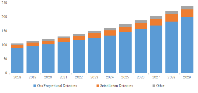製品タイプ別では、ガス比例式検出器が84.3%のシェアを持つ最大セグメントである