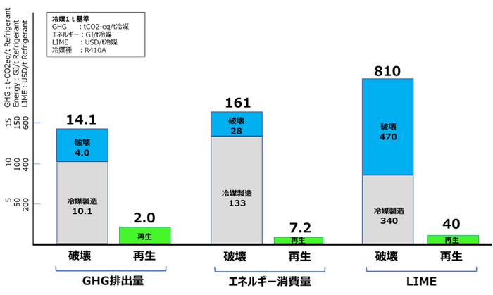 ・日本においてR410Aを再生処理する場合、破壊処理する場合と比較してGHG排出量約1/7、エネルギー消費量約1/25、LIME約1/20の値となった