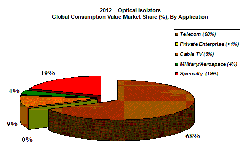 2012年には、電気通信アプリケーション部門が、世界全体の光アイソレータ消費価値のなかで68%のシェアを占めると、エレクトロニキャストは予想しています