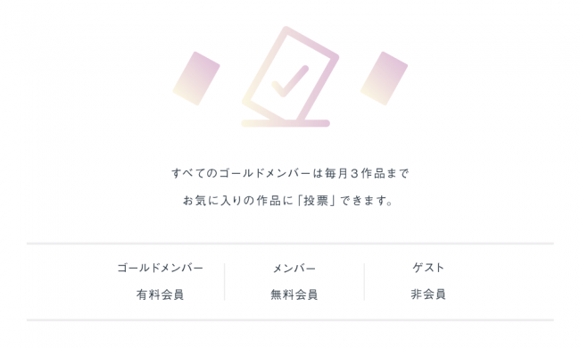 ゴールドメンバー(有料会員)の投票(毎月1アカウント3作品まで投票可能)により、毎月1日にランキングが変動します。総合ランキング1位に輝いた作品は、メンバー(無料会員)も無料でご覧いただくことが可能です。