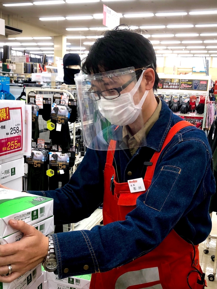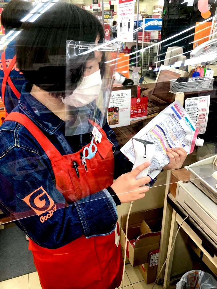 現在、このフェイスシールドを全65店舗においてグッデイ従業員(一部レジスタッフ等)が着用しながらの接客・お客様対応をしております。