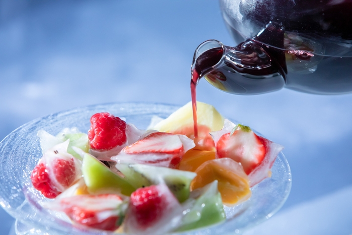 イチゴやキウイなど、凍らせたフルーツにシナモンを効かせたホットワインをかけて味わいます。フルーツの甘酸っぱさと時間の経過とともに変化する食感、口の中でふわりと広がるスパイスの香りを一度に楽しめるデザートです。