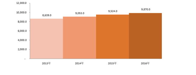 一人当たりの米国医療費、(USD)、2013ー2016年