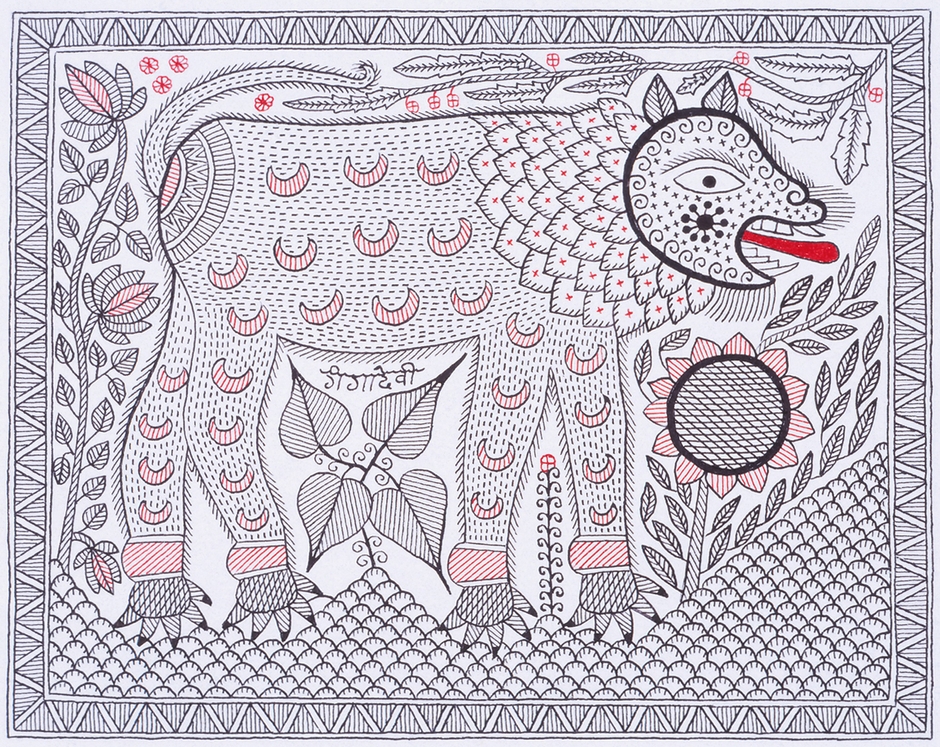 インドを代表するアーティストで、ミティラー画の第一人者として高く評価されるガンガー・デーヴィーの作品。完成を前に亡くなったため未完であるが、彼女の最高傑作といえる。