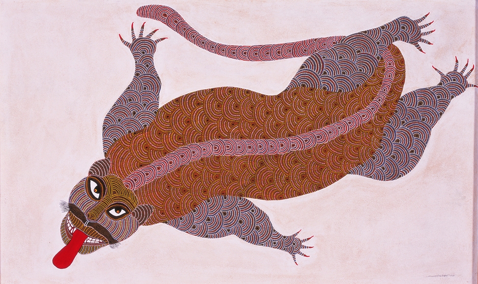 インド中央部マディヤ・プラデーシュ州一帯に居住するゴンド族は、インドの500にもおよぶ民族集団の中でも最大の先住民部族です。独自の自然信仰を持つこの民族が、祈りの気持ちを表すため、村の儀礼や祭りの際に家の床や土壁に描いていた絵が原点とされます。ジャンガル・シン・シュヤム(1960~2001)は、ゴンドの森に住む生き物、神々、伝説などを独自のスタイルで描き、民族アートの枠を超えたゴンド画を確立しました。