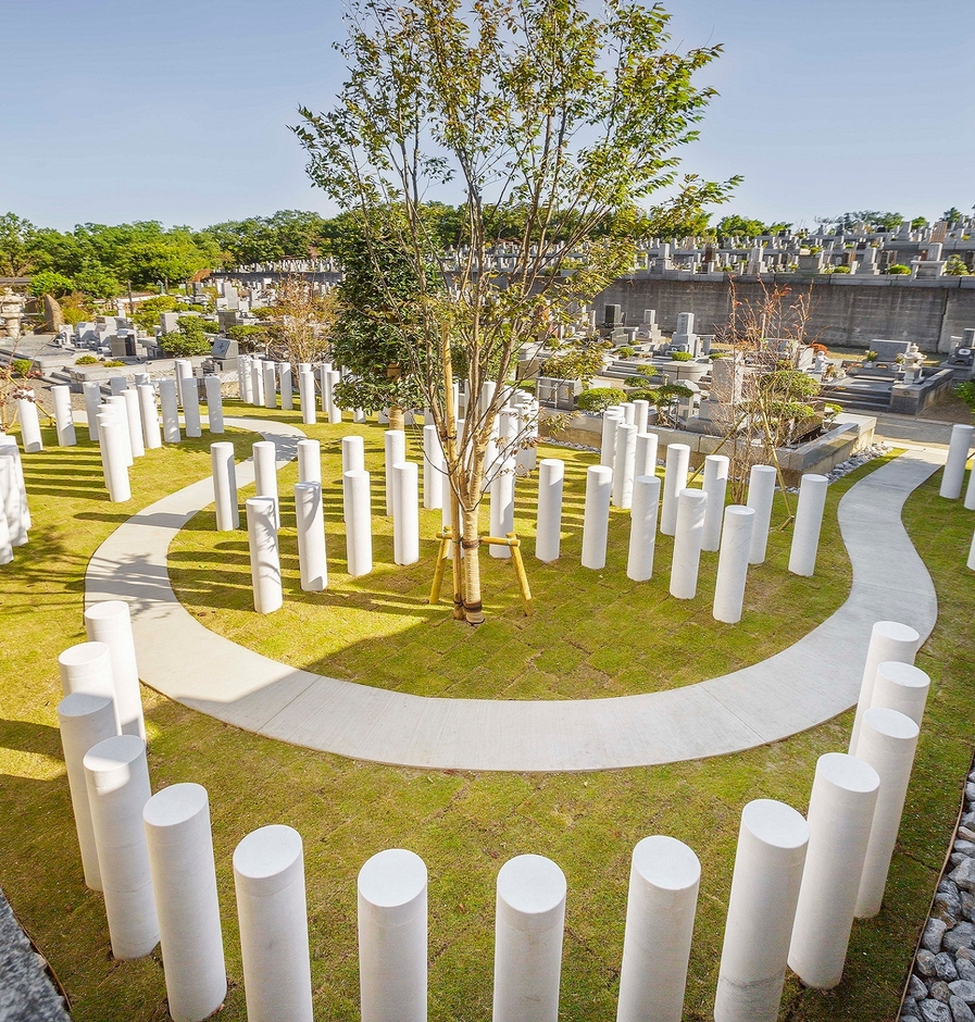 &(安堵)は、維持・継承の心配のない新しいお墓である。ふたり分のお骨が入る白い大理石のお墓である。家族でなくとも様々な間柄で入ることができる。抱きしめ、触れあい、語り合いやすいシンプルなかたちとした。敷地の形にとらわれず、様々なレイアウトが可能である。