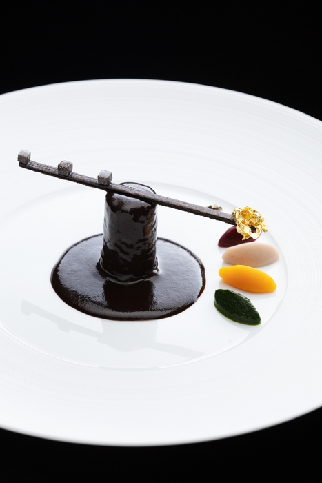 ジビエの女王とも言われる野兎は、野獣臭が強く、パサつき、硬くなりやすいため扱いが難しい食材です。ユカワタンでは、野兎の臭みを感じずに味わえるよう、赤ワインやマデラ酒など数種の酒やエシャロットなどの香味野菜、ハーブ、スパイスなど、何種類もの香りを肉に重ね合わせました。さらに、フォアグラやトリュフとともに2日間、肉がじゅうぶんやわらかなるまで煮込んだ後、1日おいて味を落ち着かせています。フランス料理に欠かせないソースには、野兎の出汁に赤ワインや香味野菜、ハーブ、スパイス、ダークチョコレートなど、いくつもの食材を合わせました。日本人の味覚に合うようまろやかにしています。さらに、長い時間煮込んだり、漉したりを繰り返し、3日間かけて完成させます。