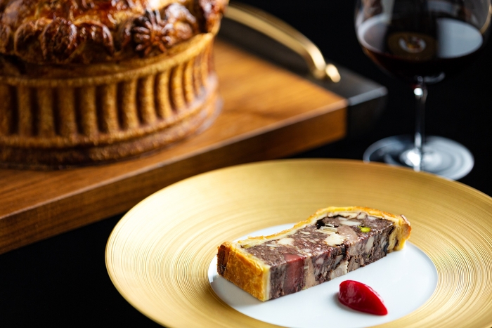 鹿や猪、山鳩、雉など4種類以上のジビエを、トリュフやフォアグラ、フルーツとともに幾層にも積み重ね、パイ生地で包み焼き上げた前菜、パテ・ド・ロワ。ジビエの種類や部位によって、ミンチにしたり、モルソー(塊)にしたりと調理法を変えている、たいへん手が込んだ料理です。