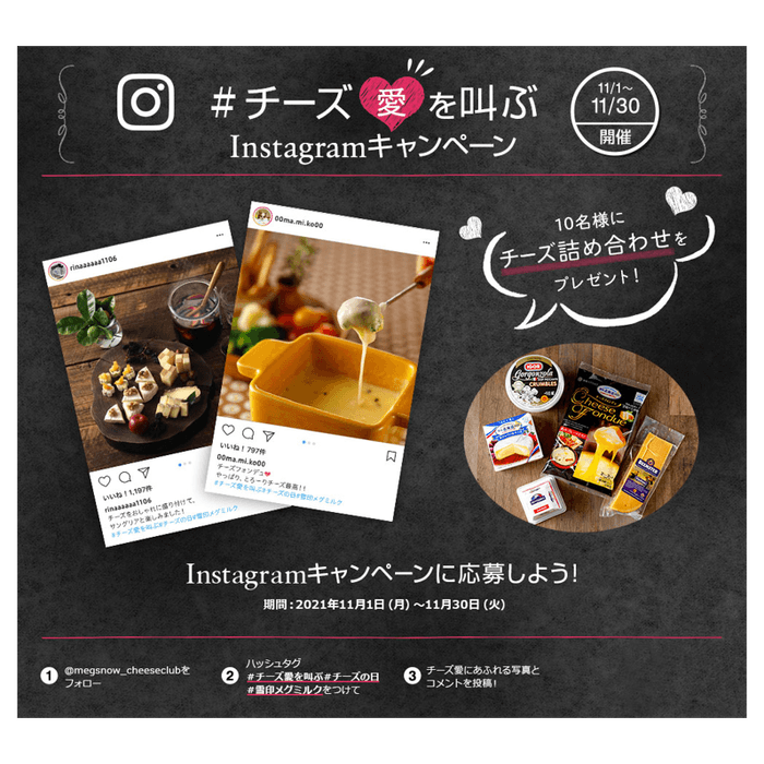 雪印メグミルク株式会社(本社:東京都新宿区、代表取締役社長:西尾 啓治)は、11月11日の「チーズの日」を記念して、2021年11月1日(月)~11月30日(火)まで、『#チーズ愛を叫ぶ Instagramキャンペーン』を今年も実施いたします。