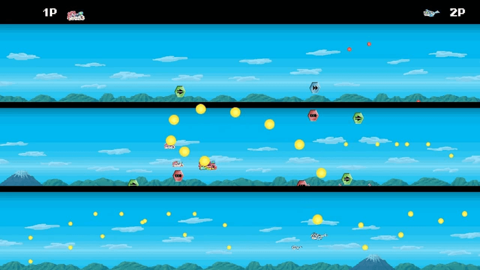 横スクロールのシューティングゲームのステージが、なんと1画面に。筐体のレバーを使ってあらゆる攻撃を避けながら進み、Aボタンで射撃します。スタート地点から、いきなり最後のボスを狙うこともできます。進みながらアイテムを取るとスピードアップをしたり、射撃の射撃距離を伸ばすこともできます。