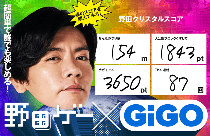 Nintendo Switch版「野田ゲー」シリーズ(※1)は、ゲームを自作するほどのゲーム好き芸人・野田クリスタルさん(マヂカルラブリー)が超おもしろ総監督を務め、 「ことばのパズル もじぴったん」の生みの親で面白法人カヤック所属のゲームクリエイター後藤裕之さんと共に開発した人気ゲームです。芸人がプロデュースしたものとしては初めてゲームセンターで「野田ゲー」アーケード(スーパー野田ゲーGiGO)として登場(※2)します。また、期間中はGiGO総本店の「大型ビジョン」と「壁面ビジョン」でサンシャイン60通りの通行人に向けて野田クリスタルさんが野田ゲーを全力でアピールします。
