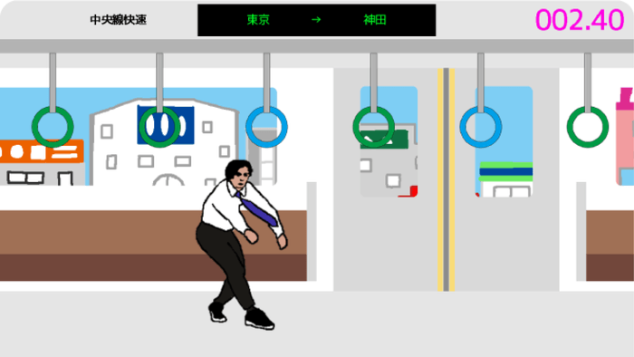 M-1グランプリ2020決勝で優勝した際に披露した漫才が元になっているゲーム。激しく揺れる電車の中で、長く画面の中にいられるようレバーを使って操作します。Aボタンで一瞬つり革に捕まることもできますが、すぐつり革がちぎれてしまうので要注意です。