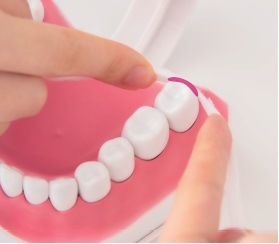 ガーゼでざっと汚れを拭き取っても歯と歯の隙間には汚れが残っています。デンタルフロスを一日一回は通す習慣を心がけてください。