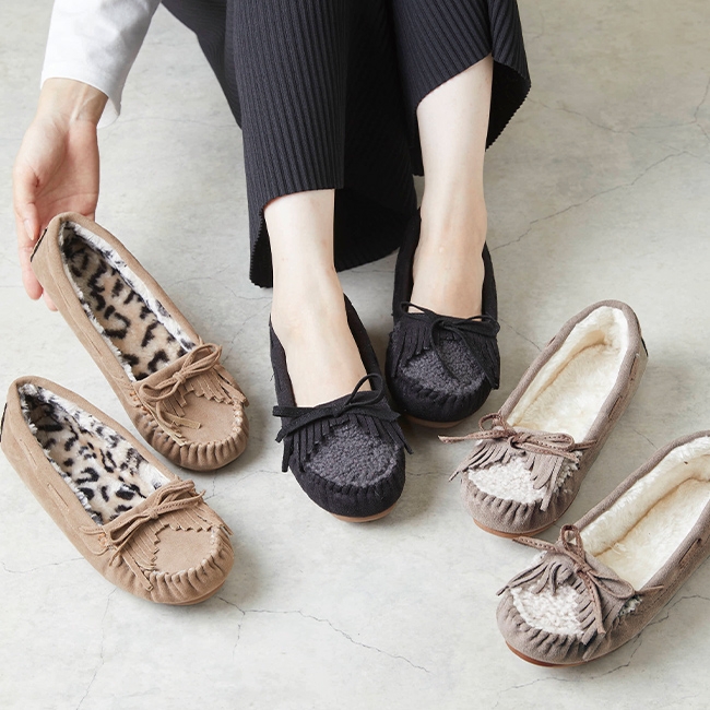 ■ふわふわあったかなのにすっきり美シルエット!フェイクファーリボンモカシン