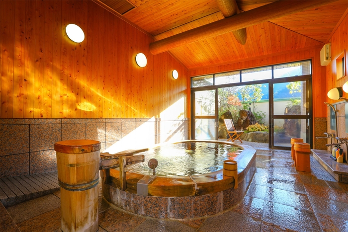 2つある貸切風呂は、どちらも木のぬくもりあふれる浴室です。化粧水のような南木曽の良泉を、独り占めしている気分になれる贅沢なひと時をぜひお楽しみください。