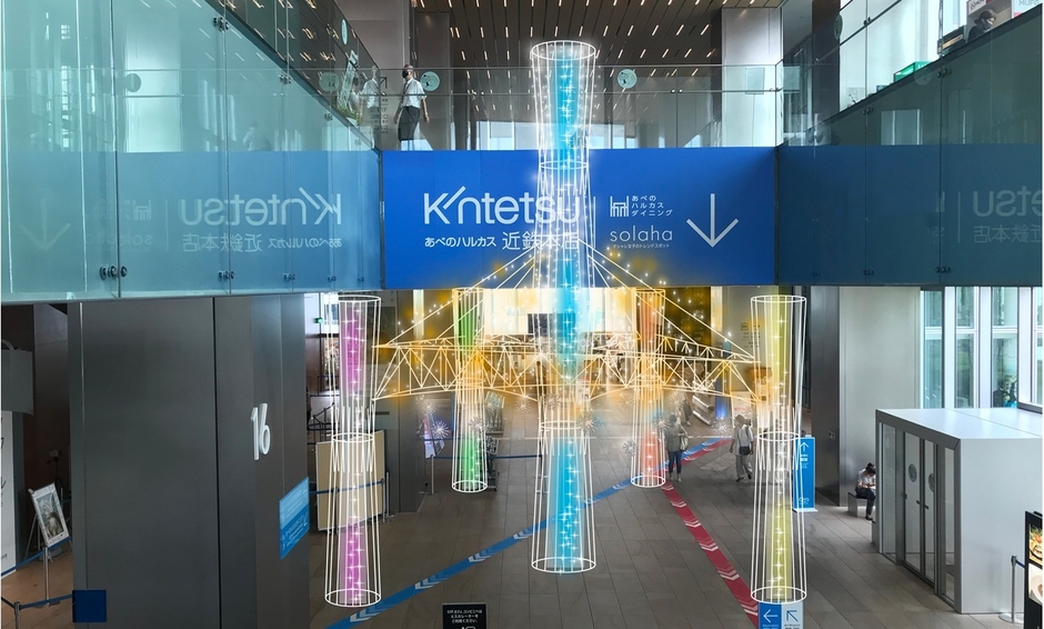 今年は、あべのハルカスを構成する展望台、美術館、百貨店、ホテル、オフィスの結節点でもある16階ロビーに、巨大オブジェ「想いを届ける光の柱」が新たに登場いたします。このオブジェは、地上と天空をつなぐ5本の柱と、心と心をつなぐ架け橋を表現しています。長引くコロナ禍において、ハルカスの名前の由来にもなっている、お客さまのこころを「晴るかす」もので、お客さまに明るい気持ちになってほしいという思いを込めて設置いたします。