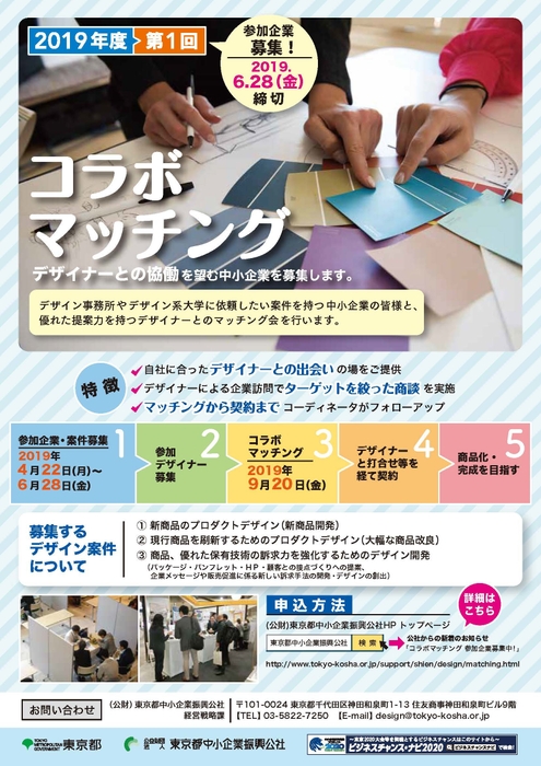 都内のものづくりをデザインの視点から支援している公益財団法人東京都中小企業振興公社は、2019年9月20日(金)、デザイナーとの協働を望む中小企業向けにデザイナーとの出会いの場として第1回コラボマッチング(商談会)をAP秋葉原にて開催します。