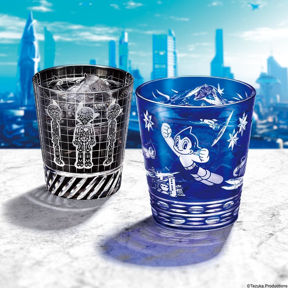 日夜正義のために未来都市の空を飛び回るアトムの勇姿を描いた<コスモブルー>と、アトム誕生の瞬間を漆黒のガラスにうつした<メカニカルブラック>の2種類。