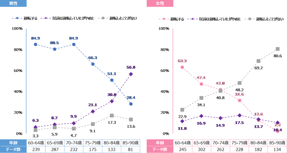 - 男性高齢者の運転率は70代前半まで8割を超え、その後は加齢とともに低下。80代前半で約5割、80代後半でも約3割が現役ドライバー。女性は男性より低いものの70代後半でも運転率は約3割。