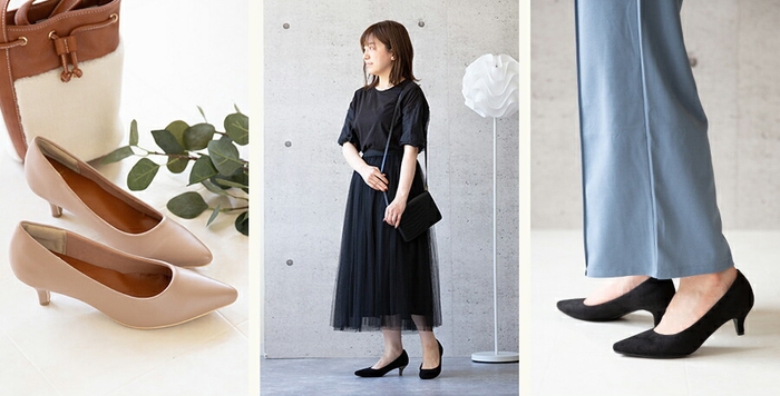 新色発売の7㎝ヒール、3cmヒール以外にも、フラット~7㎝ヒールまで、5種類の展開。お望みの1足に出会えるはず。