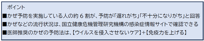 このように、かぜの流行時期を認識しているにも関わらず、予防が遅れてしまったり、不十分になってしまう方が多いようです。「予防を始めるタイミングが分からない」、「予防意識はあるけどあれこれやるのは面倒、、、」と思っていませんか?そんな方々に、かぜの流行を手軽に知る方法や、今日からできる医師推奨の予防法についてお伝えします!
