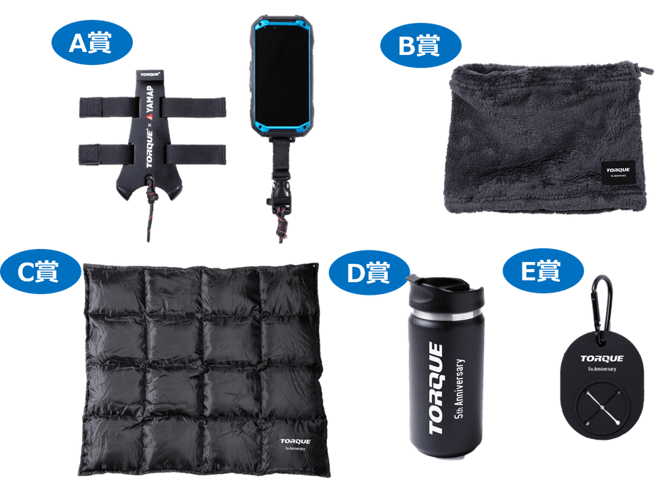 TORQUEシリーズは本年おかげさまで5周年を迎え、国内累計出荷台数は100万台を突破いたしました。日頃より本シリーズをご愛用いただいておりますオーナーの皆さまに感謝し、登山アプリ「YAMAP」とのコラボ企画で制作したスマホホルダーなどの TORQUEオリジナルグッズ(非売品)5種類を、TORQUE(トルク)にちなみそれぞれ109名様(計545名様)へプレゼントします。