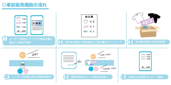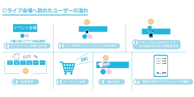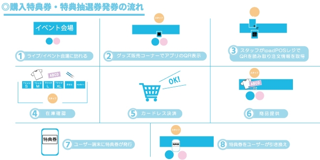 物販においては、購入者がアプリ内で事前に商品を選択、会場では注文の読み込み・商品の受け渡しをすばやく行い、アプリ内に登録したカードでカードレス決済するだけ。