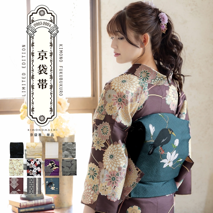 京都きもの町オリジナルブランド「KIMONOMACHI」のカジュアルな京袋帯です。「もう少し帯をしっかりとした素材感のものにしたい」と考えている着物好きさんにも喜んでいただけるよう、きもの町オリジナルで作っています。織り特有の立体感、華やかさと素材感が魅力です。袋仕立てで、前の幅を調整できるので、少し広く取りたい方にもオススメです。ポリエステルなので、汗や水分で縮まず気軽に使えます。
