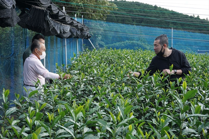 原料の茶葉選びには、静岡県浜松市役所の産業部農業振興課の協力を得て、茶農家の紹介を受けました。星野リゾートのレシピ開発リーダー・浜田統之、界 遠州の総支配人・斎藤高之、同館のお茶のおもてなし開発担当・長谷川滋春が茶畑を訪れ、羊羹の材料となる茶葉の選定を行いました。羊羹作りを前提に、一番理想となる風味にこだわり、候補の中から選んでいます。レシピ開発においては、それぞれのお茶そのもの味わいをいかに引き出すかを考え、餡(あん)の分量を通常のものよりも減らし、茶葉の香りを最大限生かす方法を模索しました。