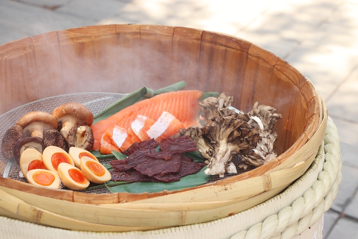 日本酒を美味しく味わうためのおつまみは、酒樽スモーカーと名付けた特製の燻製器で燻した信州サーモンや鹿ジャーキー、そして、キノコの炭火焼です。燻製と炭火の香りにお酒が進み、ほろ酔い気分に会話も弾みます。
