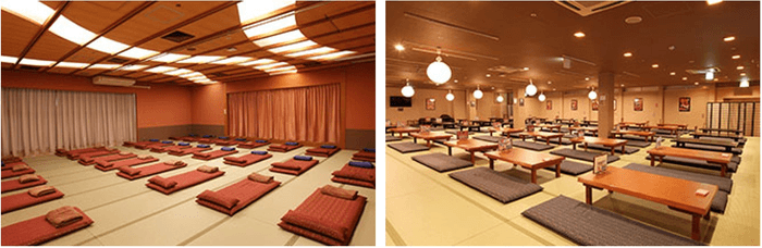 左:簡易マットレスを敷き詰めた無料の「お休み処」。男女一緒にご利用いただけるお部屋と、女性専用のお部屋をご用意しているので女性同士でも安心してお休みいただけます。