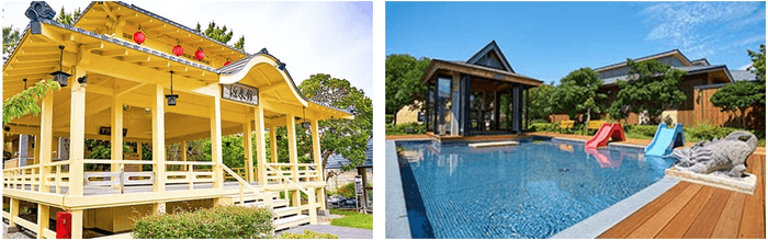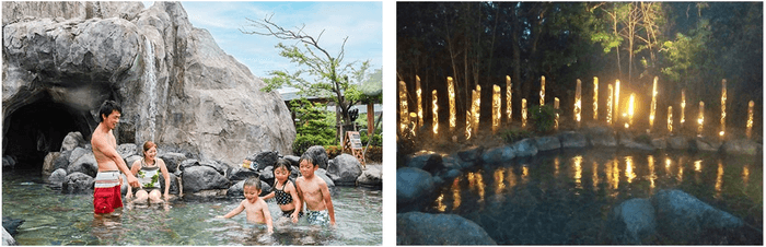 プールのような大きな浴槽や天然温泉溢れる露天風呂を、男女一緒に水着で楽しめる屋外空間。