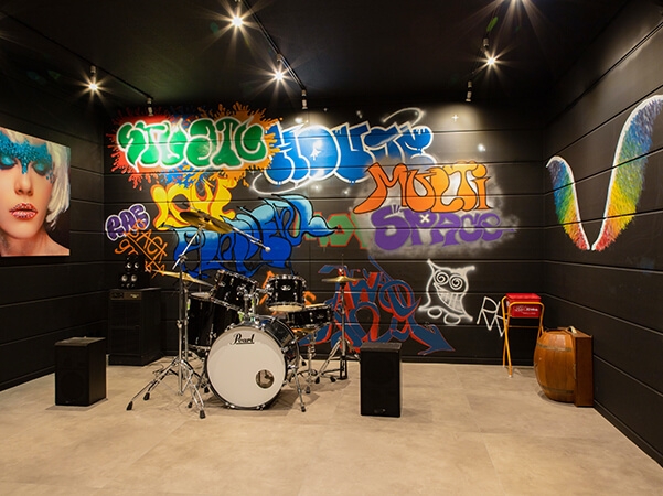 地下室は、グラフィティアートの部屋にドラムセットを完備