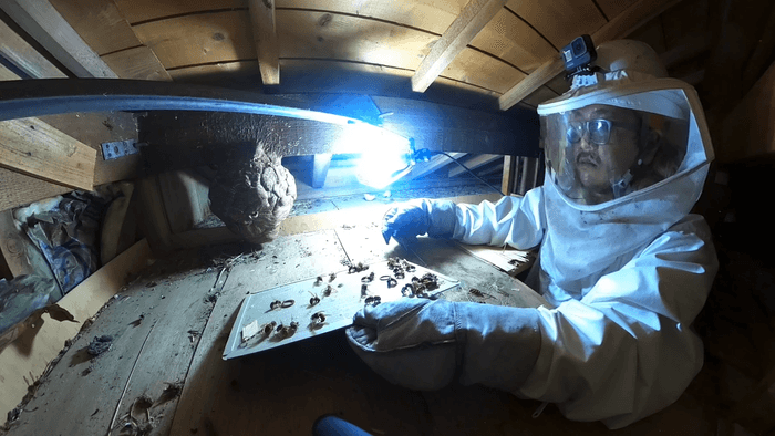 さらに、ハチの駆除に加え「巣の場所が分からないので見つけてほしい」という依頼先では、狭く動きづらい屋根裏で人の頭ほどある巨大な巣を発見!目の前に飛び交う大量のハチと闘いながら捕獲する望月さん・・・。果たして無事に巣を撤去し、女王蜂を見つけることができたのでしょうか。