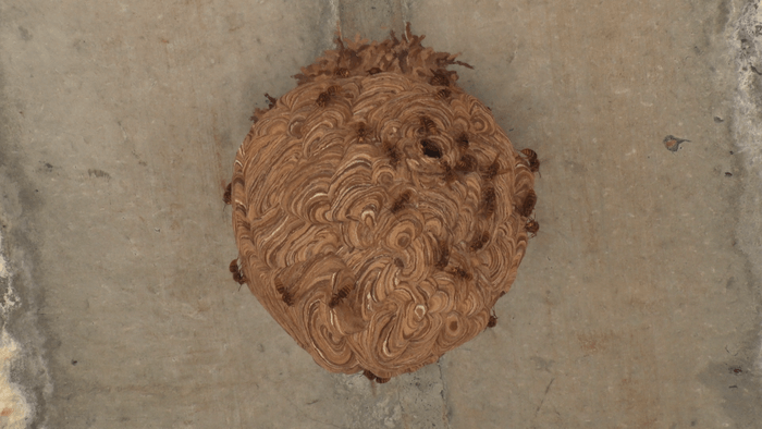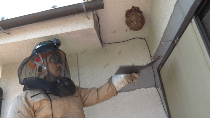 依頼先の山梨県甲州市の住宅を訪れた望月さん。2階の軒先に巣がぶら下がっていました。数種類いるスズメバチの中でも警戒心が強く、凶暴性も高いキイロスズメバチ。巣はこのまま放っておくと3倍にも大きくなる危険な状態です。