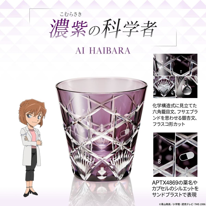 灰原哀をイメージした【濃紫(こむらさき)の科学者】と、安室透をイメージした【苅安色(かりやすいろ)の私立探偵】、澄んだ煌めきに匠の技が息づくガラスの逸品です。