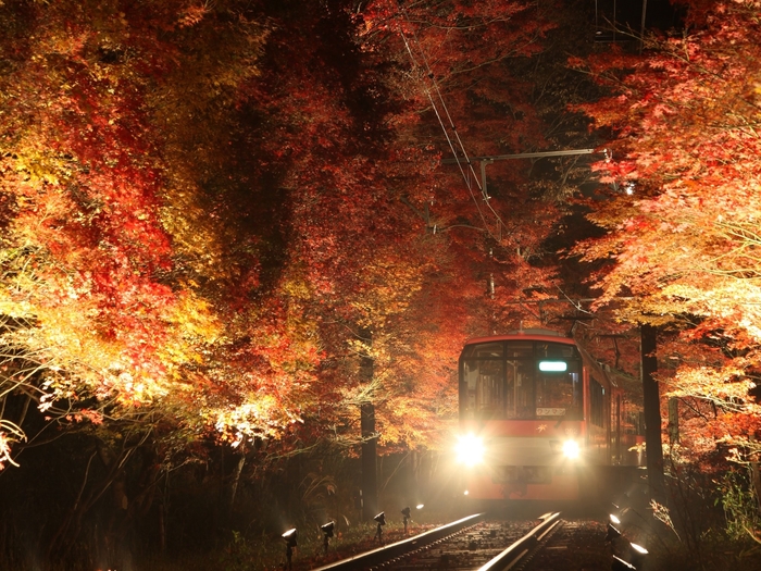 また、叡山電車では鞍馬線市原駅~二ノ瀬駅間にある「もみじのトンネル」でライトアップを実施します。「もみじのトンネル」を通り抜ける列車は、車内の灯りを消して速度を落として運行し、幻想的に照らし出された紅葉をご覧いただけます。