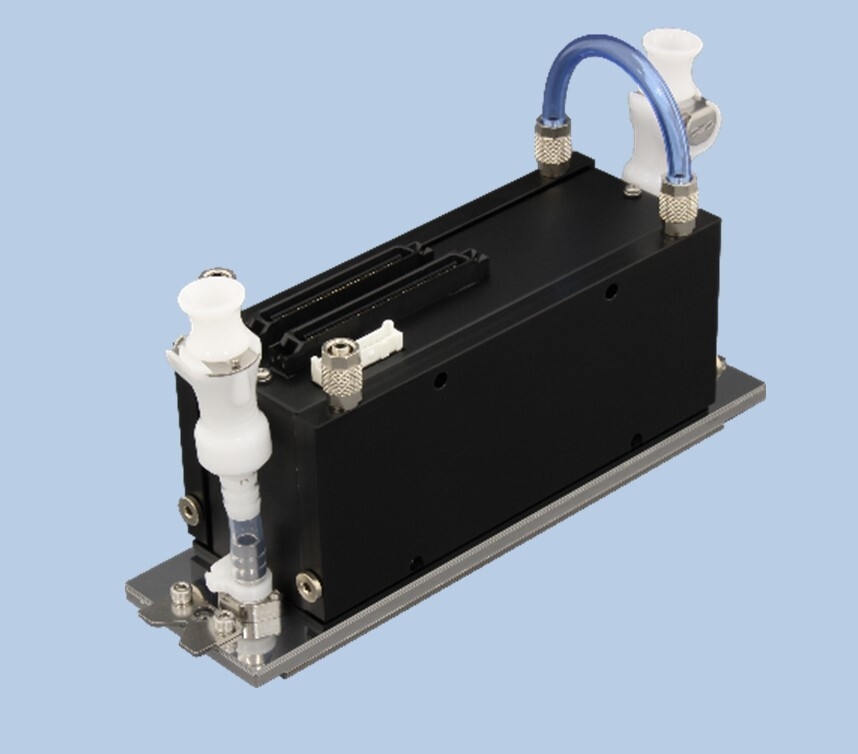 京セラ独自のノズル近傍循環機構により、ノズル乾燥を回避。均一な温度管理とインク成分の沈降を抑制し、安定した印刷を可能にしたことで、速乾性インクなど多様なインクでの印刷に対応できます。また、ヘッドクリーニングなど再稼働時のメンテナンスの削減にも貢献します。加えて、本製品は水冷※3仕様が標準となっており、水冷機構による連続印刷と印刷特性の安定性を確保しています。