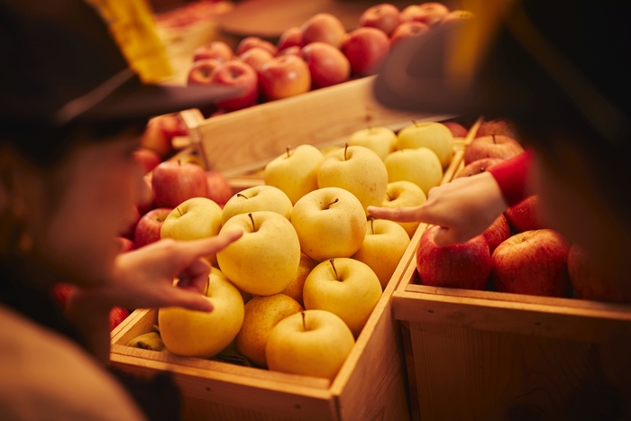 りんごは秋に収穫の最盛期を迎えます。青森県内の青果市場では、糖度や見た目の美しさなどを基準にランクが設けられ、8月から12月まで激しい競りが行われています。また、時期によって収穫される品種が異なるため、9月から11月の間だけでも競りにかけられる品種が変わります。青森屋の競りでは、りんごの系統図や味の比較ができるチャートを用い、出品されるりんごの品種や味、生産方法について説明します。館内でりんごの競りを気軽に体験しながら、りんごの品種や味、生産方法について知っていただきたいと考えています。